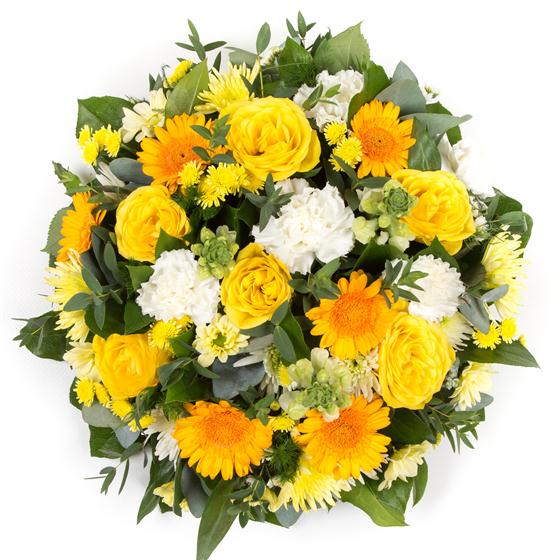 This colourful posy arrangement mixes gold roses and mini gerberas with lemon spray chrysanthemums, antirrhinums and white carnations. The standard size is 12'' in diameter.