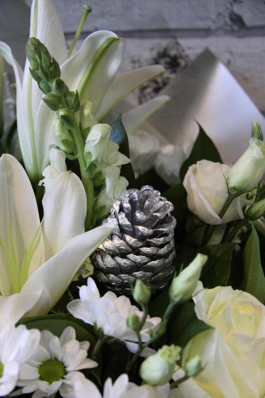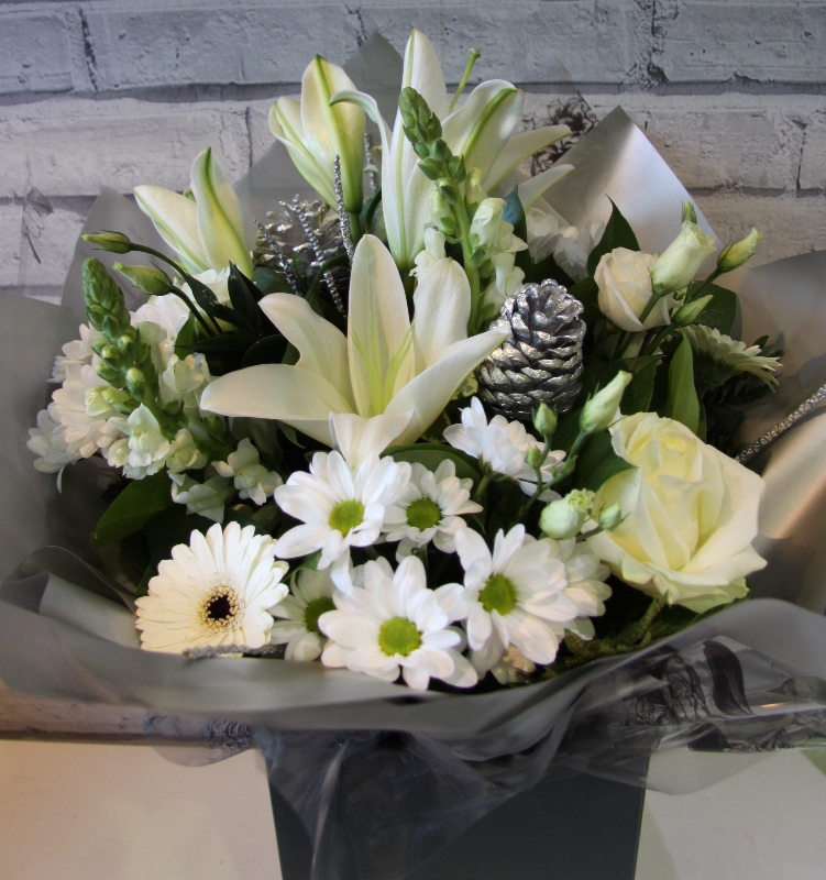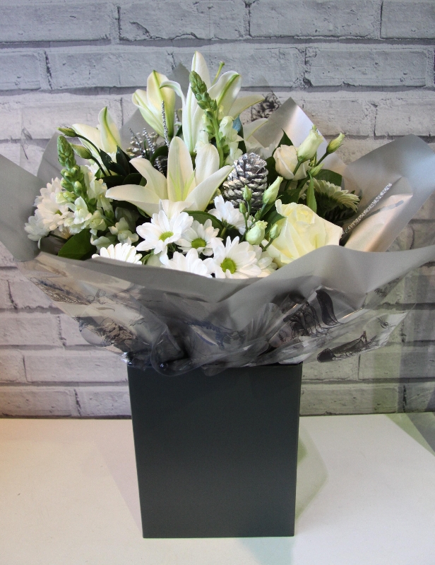 This lovely wintery white hand tied features white spray chrysanthemum, white lisianthus, white lily, white roses and foliage. The flowers are wrapped in grey paper and presented in an elegant grey box.