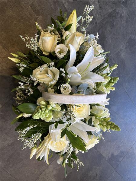 All white basket including lilies, roses and other mixed white flowers. flowers may vary due to availability.